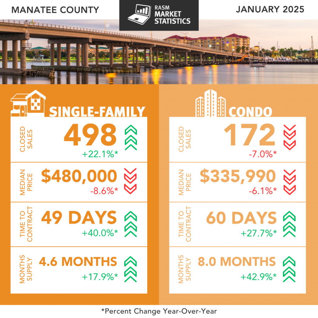 SARASOTA, Fla. (February 21, 2025) – The REALTOR® Association of Sarasota and Manatee (RASM) has released its January 2025 real estate market report, providing an in-depth analysis of key trends across both counties. Based on data from Florida REALTORS®, the housing market in Sarasota and Manatee Counties for January 2025 reflects notable shifts, including increased inventory, longer sales timelines, and price adjustments across property types.